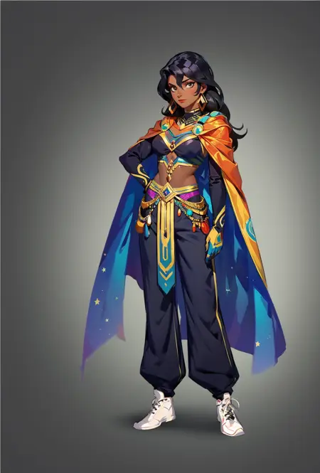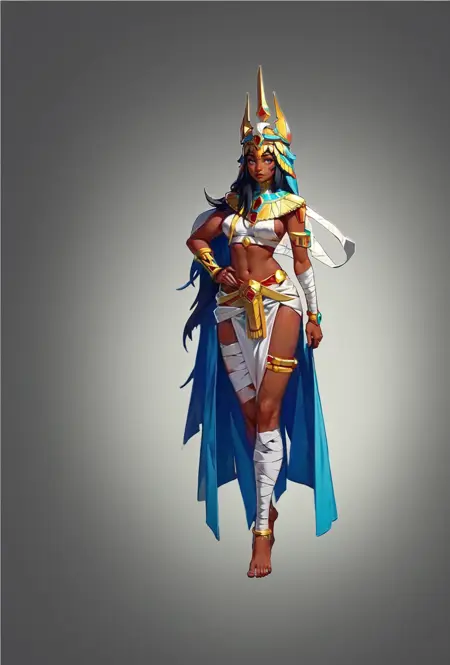例:エジプト風が欲しい場合は(コンセプトアート、手描き作品、エジプト風衣装、オリジナルキャラクターデザイン)と記述してください。