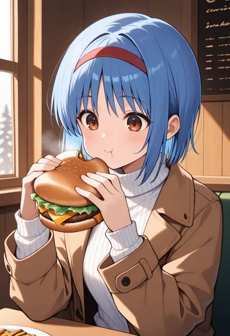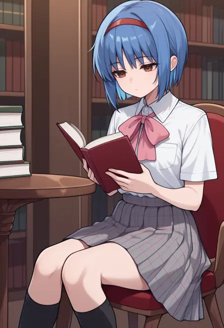 트리거 + 외모: nish1zono, 단발, 파란 머리, 빨간 헤어밴드, 갈색 눈