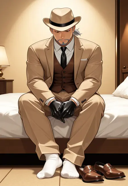 西装装:1boy, Baek, SuitBaek, 米色软呢帽, 灰发, 短马尾, 棕色眼睛, 有胡须, 米色长款西装外套内搭棕色马甲, 长袖扣领衬衫配黑色领带, 黑色皮手套, 长款米色西裤, 棕色皮鞋(必须包含“SuitBaek”才能获得更准确结果,删去不需要的提示词)