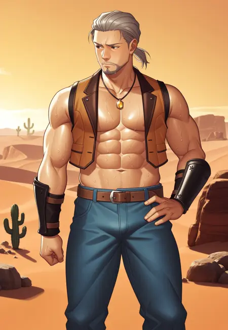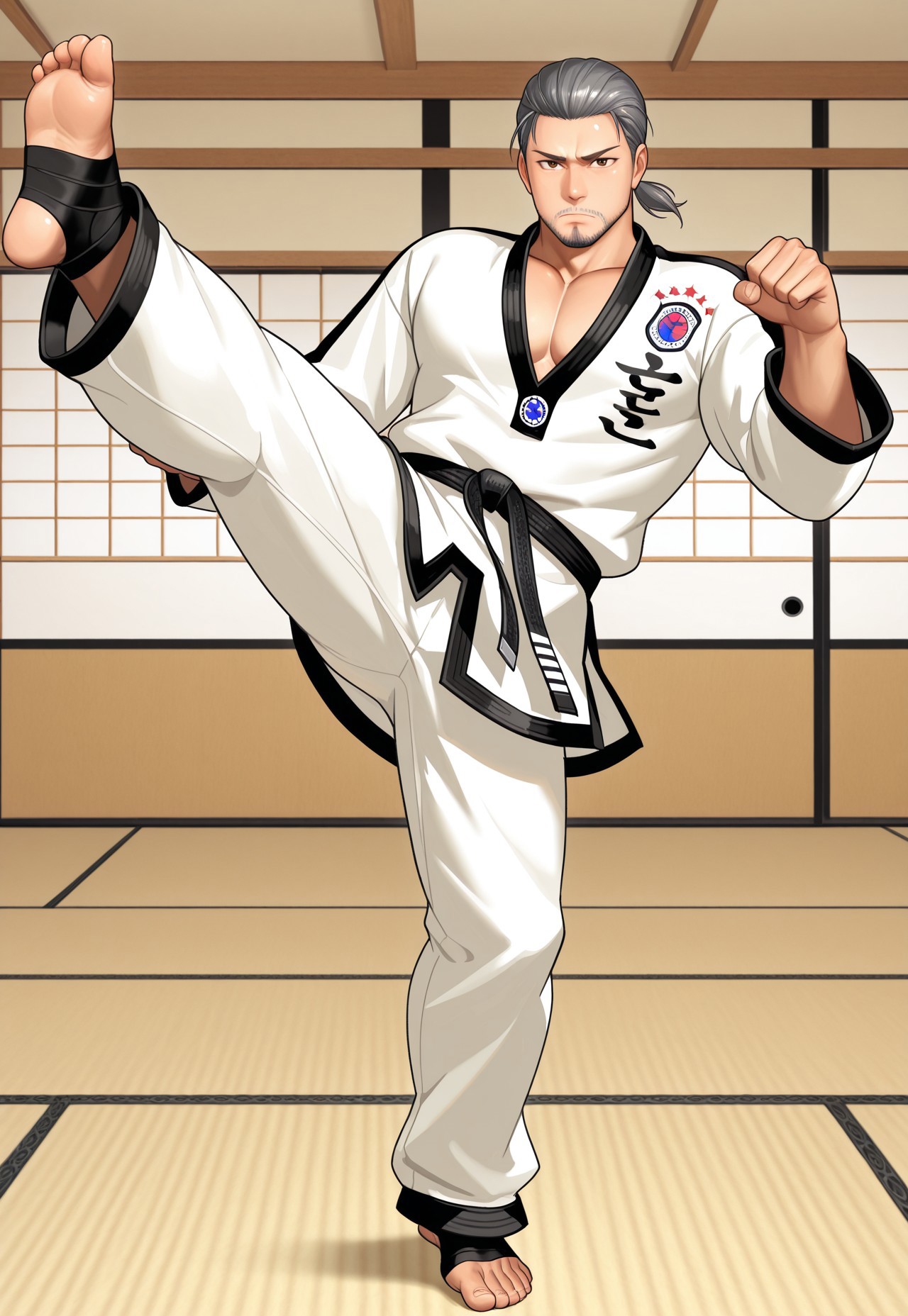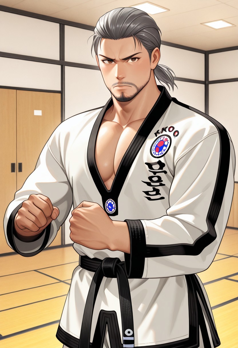 默认装:1boy, Baek, 灰发, 短马尾, 棕色眼睛, 有胡须, 跆拳道道服, 跆拳道制服, 胸部线条明显, 胸部右侧有黑色韩文字母“한”, 跆拳道黑带, 腰间系黑带, 跆拳道长裤, 黑色脚裹(删去不需要的提示词)