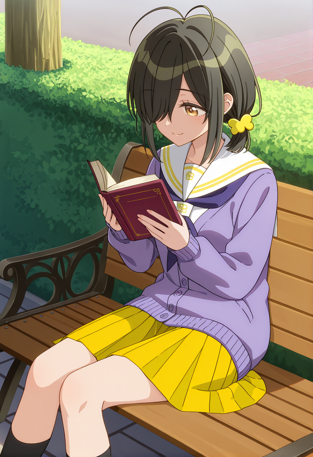 - KOTONO SHIUNJI,black hair,brown eyes,antenna hair,hair ornament,hair over one eye,