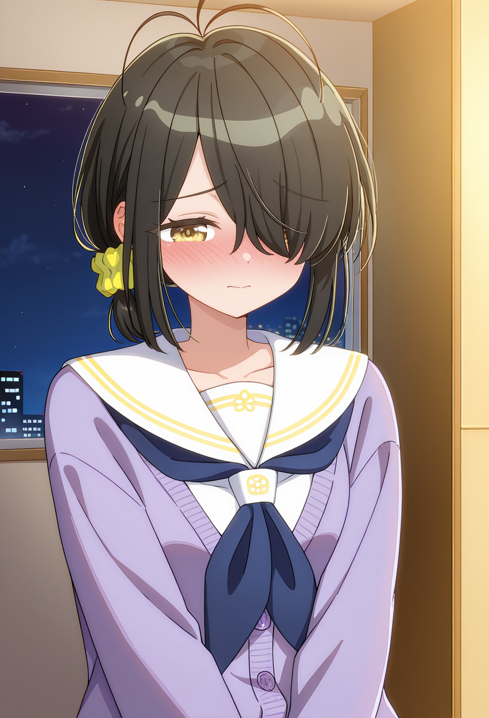 - serafuku,yellow skirt,purple cardigan,pleated skirt,black socks,