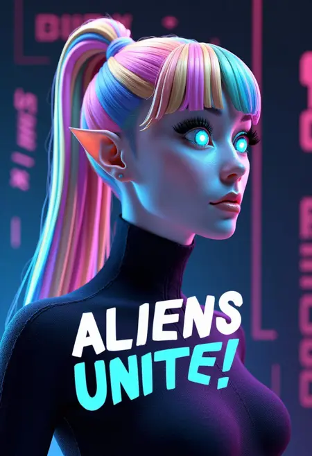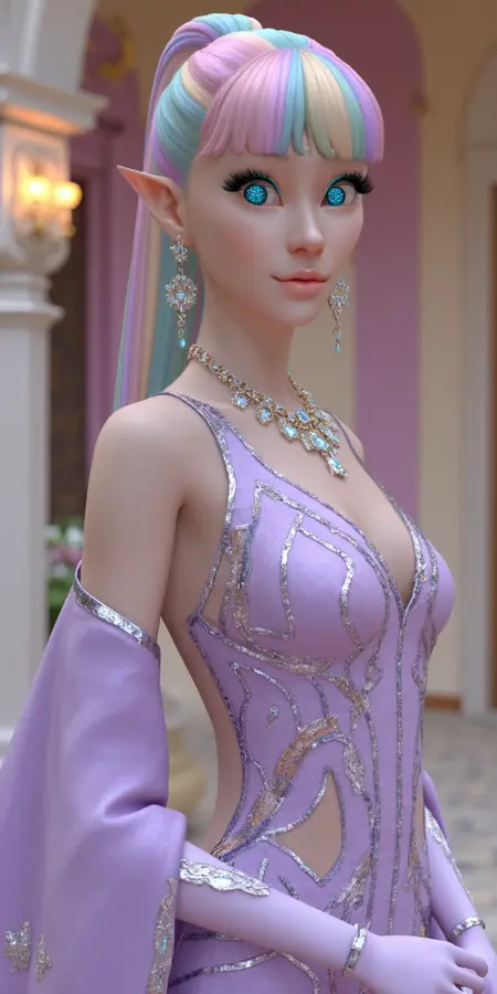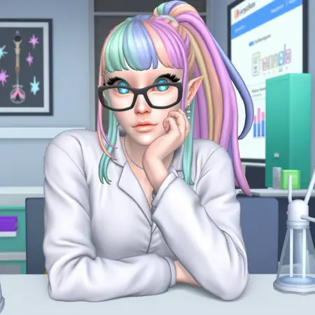 エイリアン/ヒューマンハイブリッドシム。プロンプト: "natgsim 女性、パステルレインボー色の髪を高いポニーテールにスタイリング、とがった耳、青く光る目"。30枚のレンダリングとTS4スクリーンショットで学習しました。