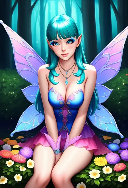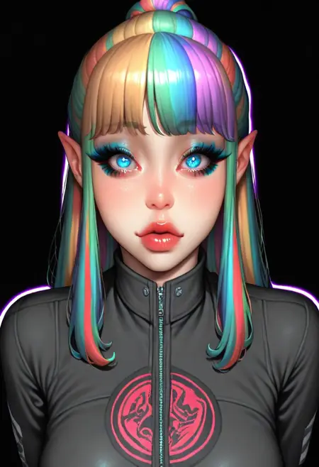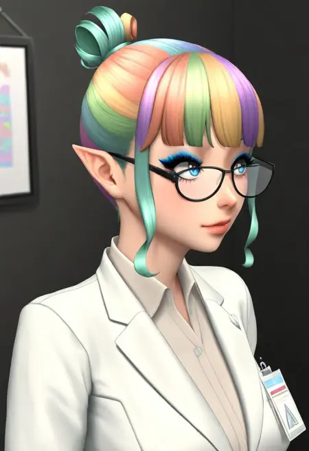 A Alien/Human Hybrid Sim. prompt: "natgsim women, with pastel rainbow-colored hair styled in a high ponytail, pointy ears, blue glowing eyes". Trained with 30 Images from Renders and TS4 Screenshots.