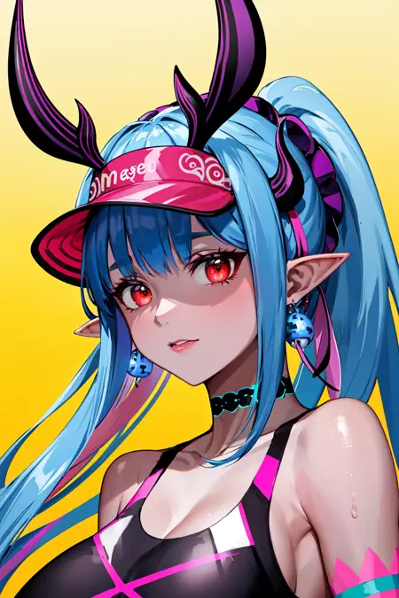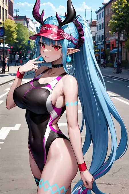 衣装11girl, solo, long hair, multicolored hair, blue hair, pink hair, ponytail, sidelocks, bangs, horns, visor cap, pointy ears, earrings, red eyes, colored skin, grey skin, body markings, large breasts, choker, clothing cutout, one-piece swimsuit, wristband