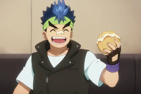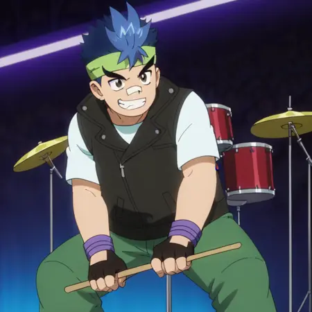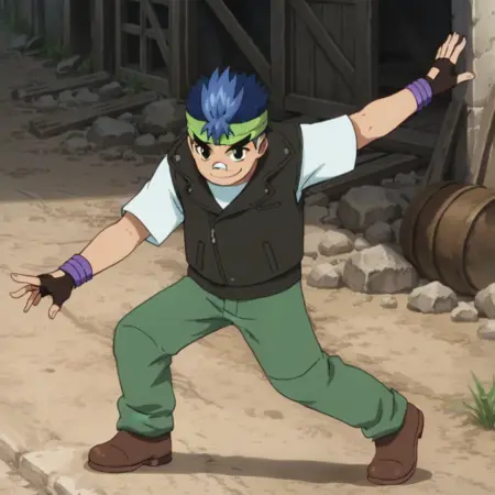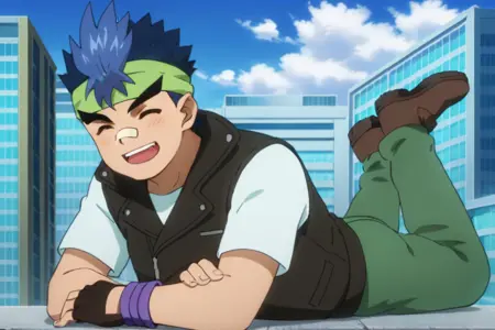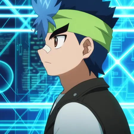 プロンプト:男性、がっしりした体型、青い髪、とがった髪型、ヘアバンド、茶色の目、濃い眉、鼻に絆創膏、ベスト、白いTシャツ、紫のリストバンド、指なし手袋、緑のズボン、靴、屋内(更衣室/ソファ)、屋内(舞台/観客)、屋外(都市/空/建物)、屋外(橋/空/雲/草)、屋外(採石場/空/雲)、屋外(スタジアム/観客/写真背景)、ホログラフィックインターフェース