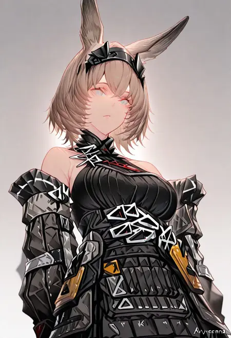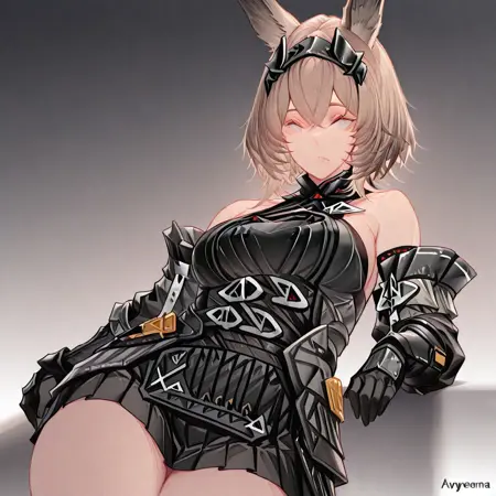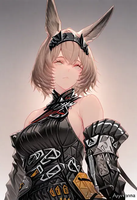 avywenna, rabbit_ears, short_hair, hair between eyes, detached sleeves, bare shoulders, black dress, black gloves, skirt, armor