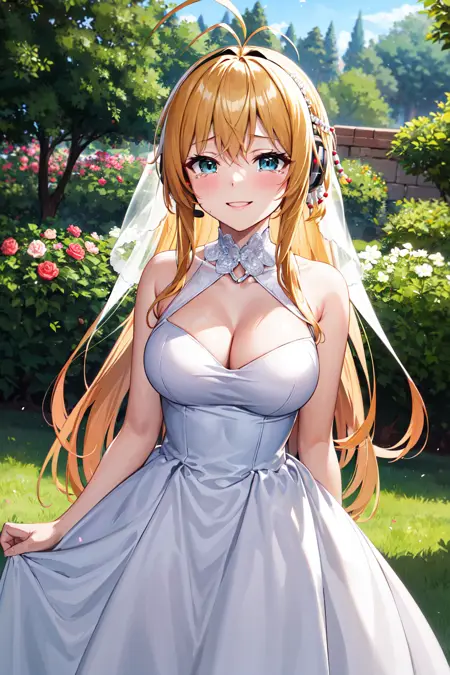 outfit1aamaki, long hair, antenna hair, hair beads, headphones, red necktie, cleavage cutout, sleeveless shirt, collared shirt, detached sleeves, black sleeves, red skirt, single thighhigh, red thighhighs