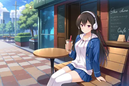 Casual01, white_zipper_hoodie, blue blazer, long_sleeves, blue_skirt, miniskirt, white_thighhigh,