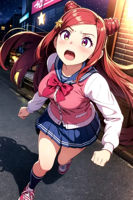 ・MGCM school uniform(분홍색 재킷, 긴 소매, 리본 넥타이, 파란 치마, 양말, 별 무늬, 스니커즈, )