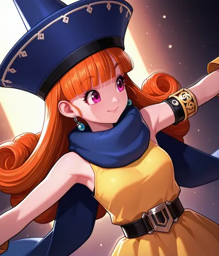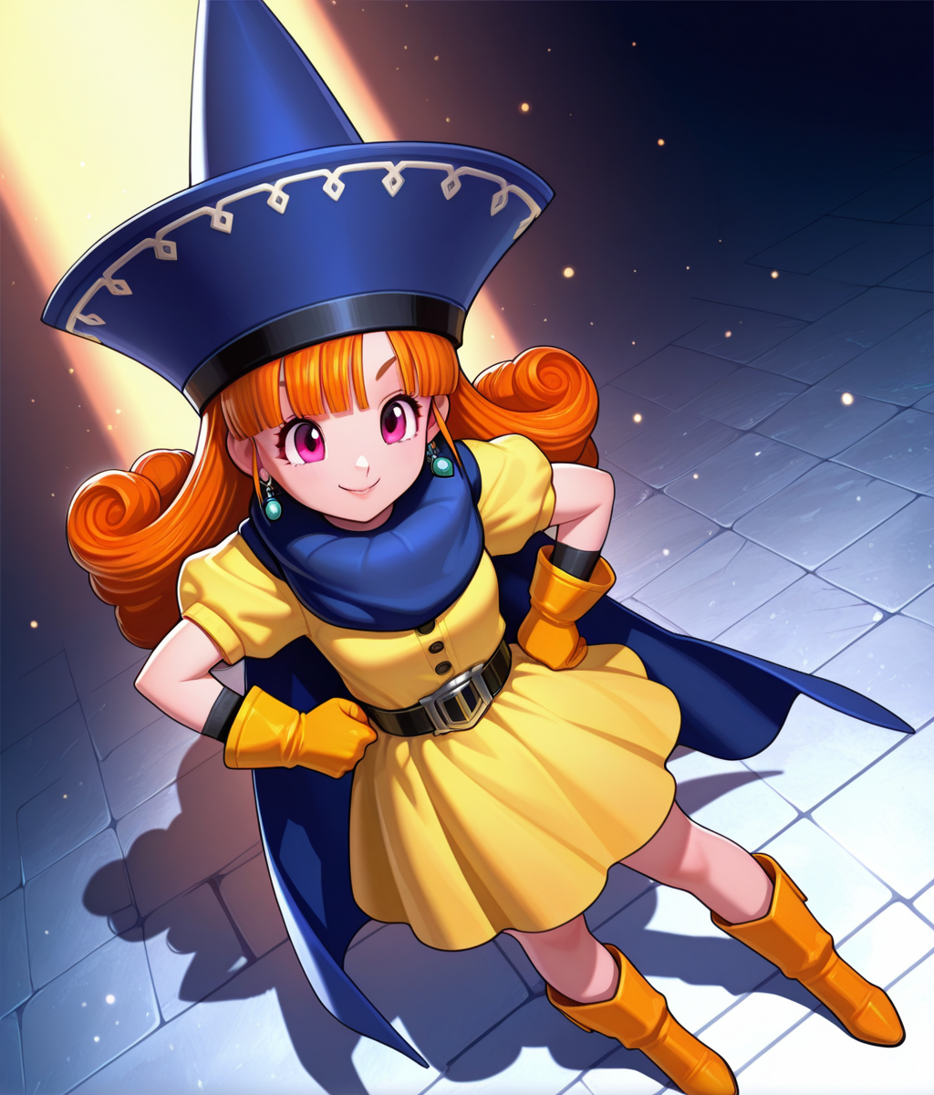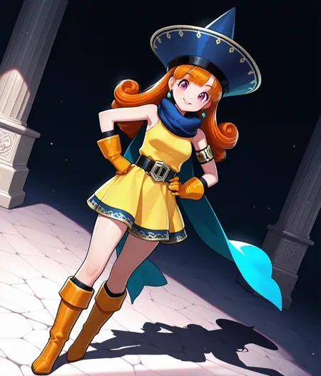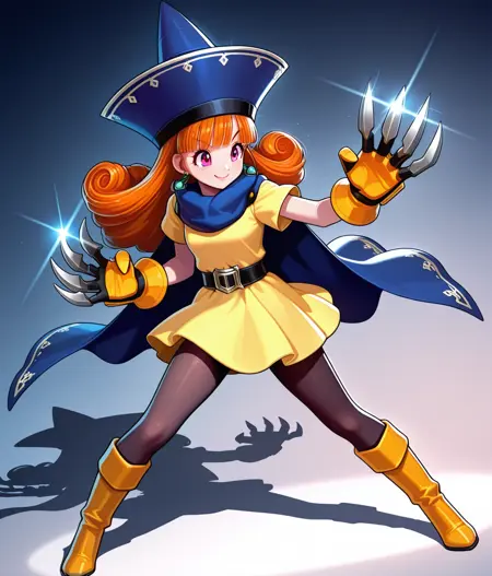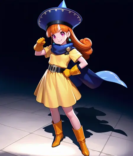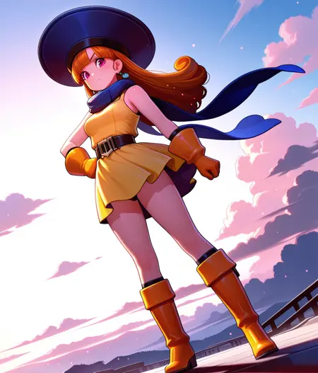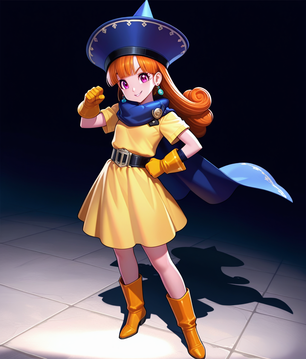 옷: 파란 모자, 장신구, 귀걸이, 노란 드레스, 파란 망토, 짧은 드레스, 주황색 무릎 부츠, 팔이 없는, 벨트, 파란 스카프, 어깨 노출