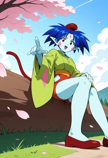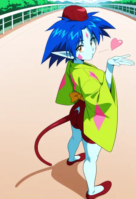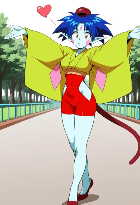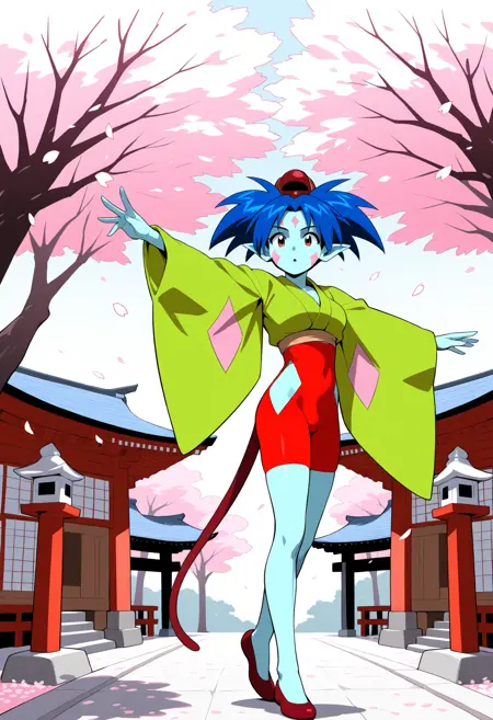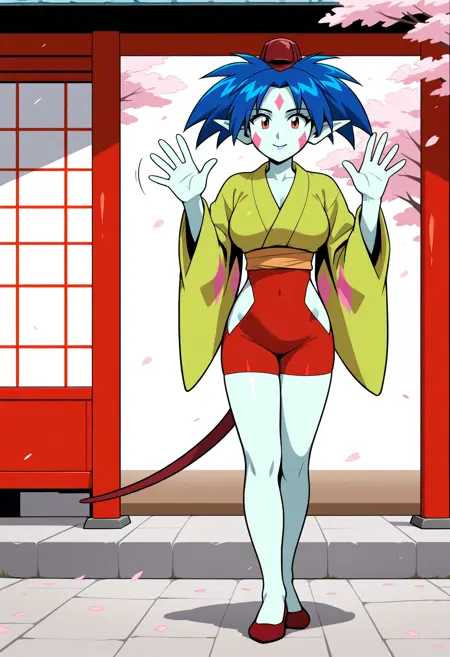 ponko, 1girl, solo, 짧은 머리, 긴 소매, 전체 몸, 일본 복장, 뾰족한 귀, 넓은 소매, 색상이 있는 피부, 펼쳐진 팔, 팔 벌림, 1990년대, (스타일), 의상 컷아웃, 꼬리, 얼굴 무늬, 빨간 신발, 빨간 머리 장식, 레트로 아트 스타일