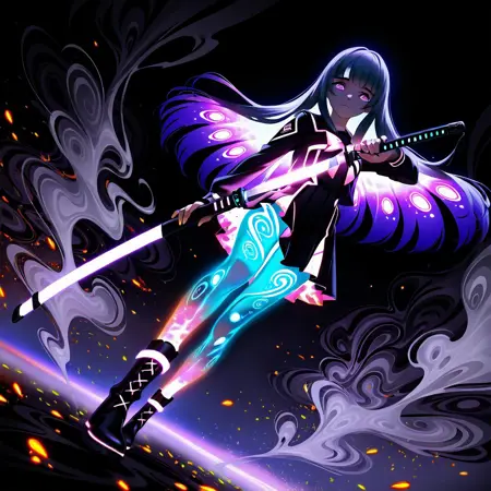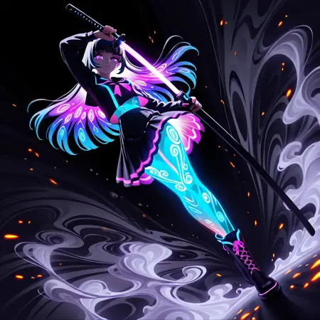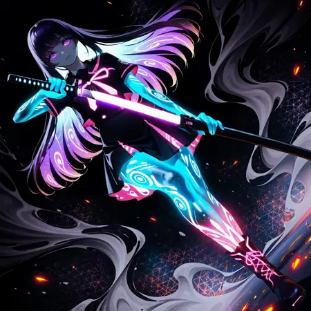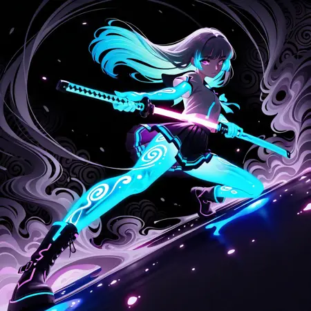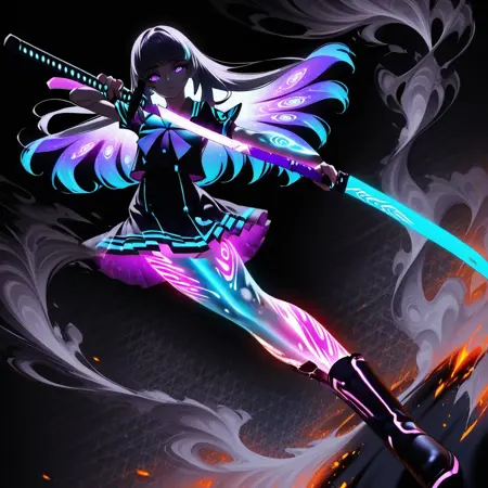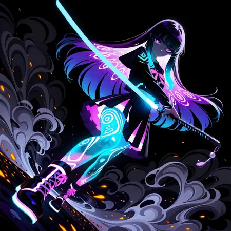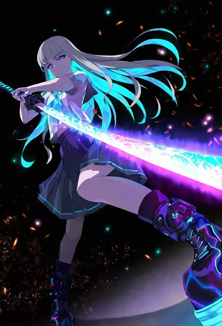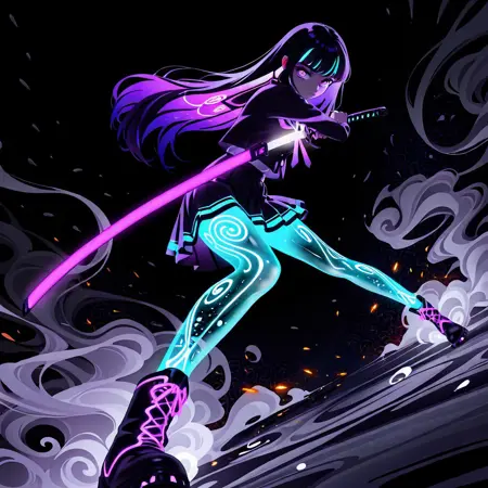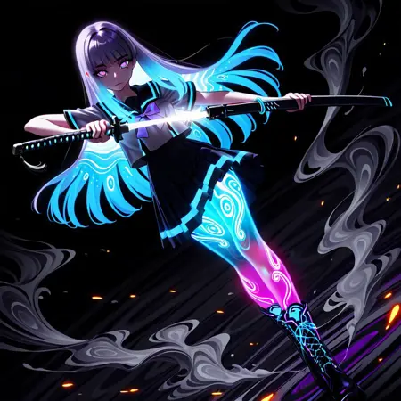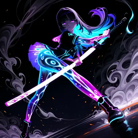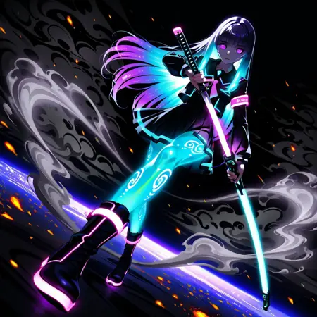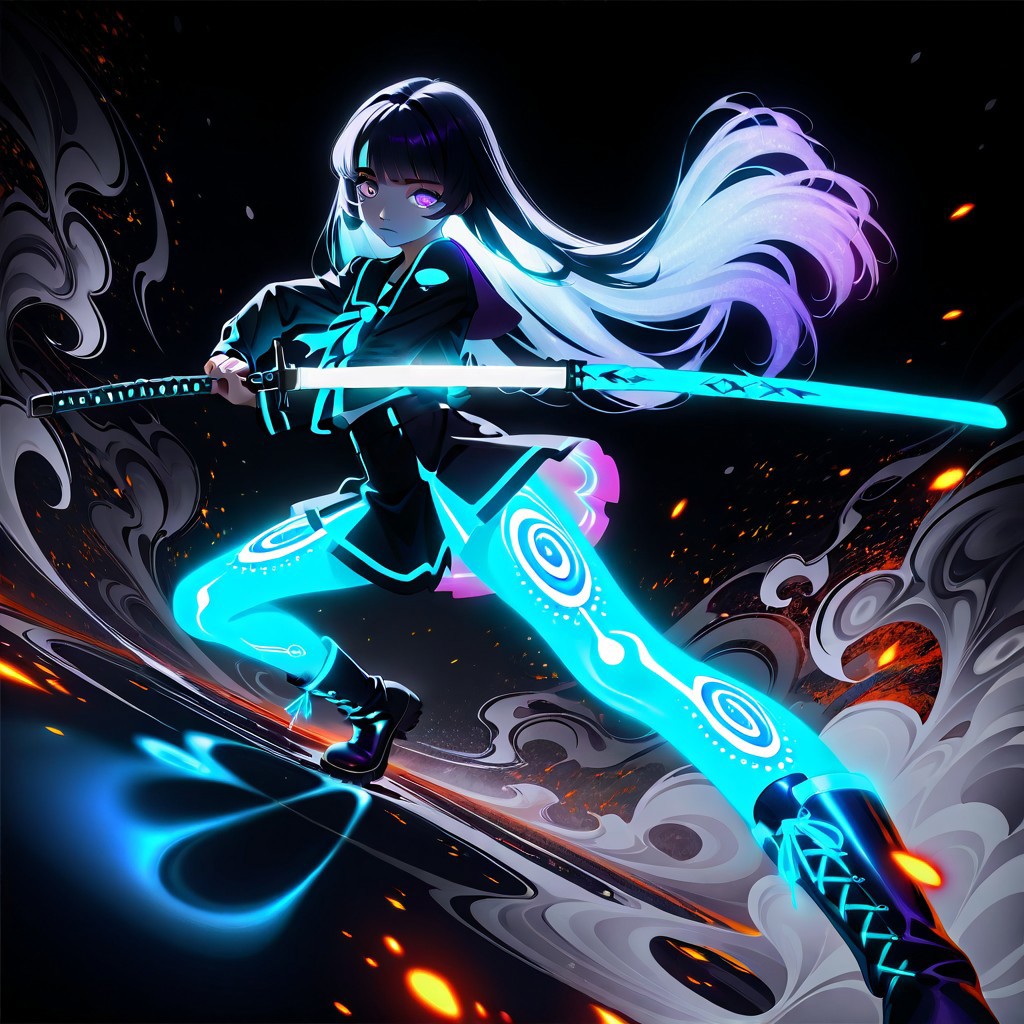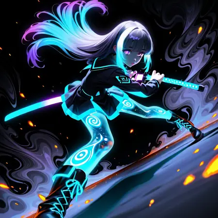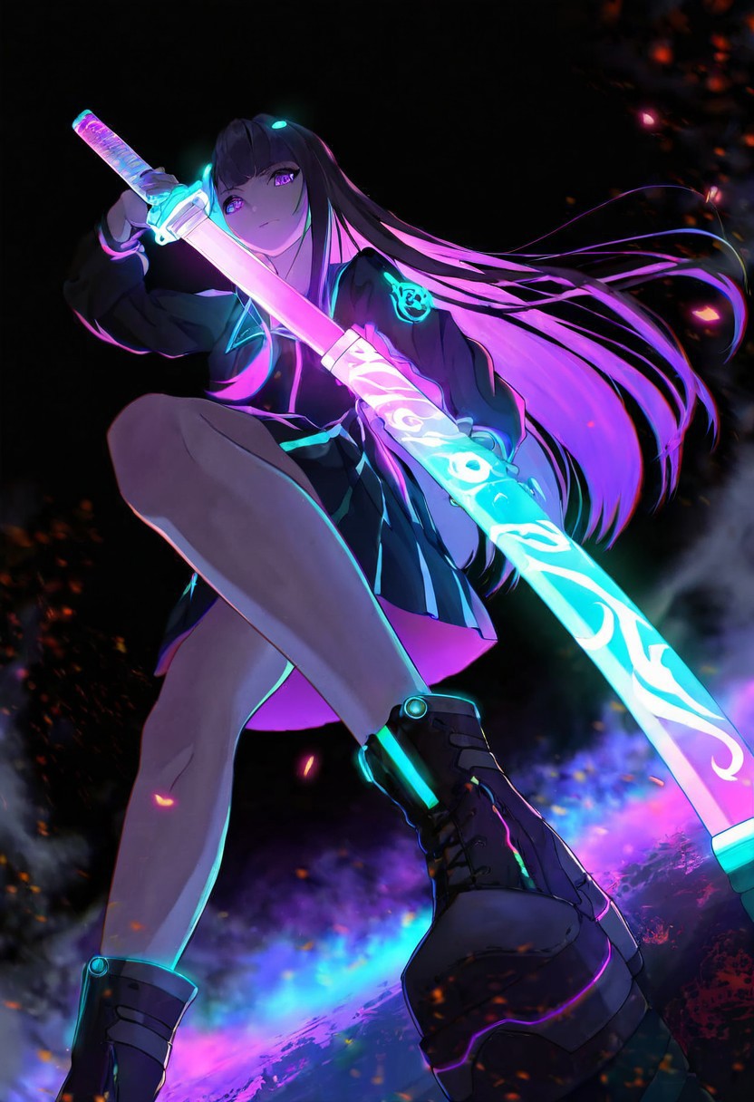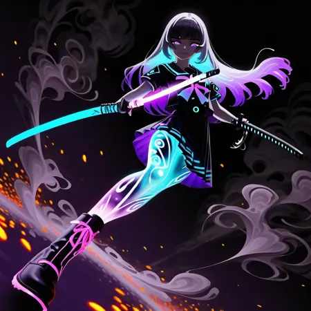 생물 발광 투명한 피부, 32k, 명작, SmoothNoob_Quality, 역동적인 구성, 1소녀, 1명의 소녀, 생물 발광 투명한 신체, 손은 네온 생물 발광 투명한 칼에, 칼을 뽑는 중, 생물 발광 투명한 학교_uniform, 싱글, 네온 생물 발광 투명한 머리카락, 시청자 바라보기, 앞머리, 보라색 눈, 긴 머리, 입을 닫음, 재들, 검은 배경, 부츠, 역동적인 자세, 더치 각도, 단축법, 석양, 빛나는, 잉크 배경, 추상적 배경, 밝은 색상, 어두움, 진주 테마, 회색 연기, 네온 트림,