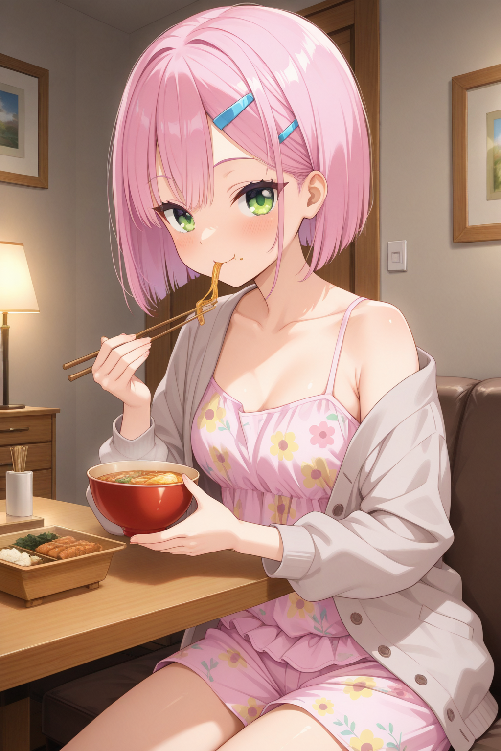 ccamane, 緑の目, ピンクの髪, ボブカット, ヘアクリップ, パジャマ, グレーのカーディガン, 開いた服, 片方の肩を露出, ピンクのキャミソール, ピンクのショートパンツ, 花柄プリント,