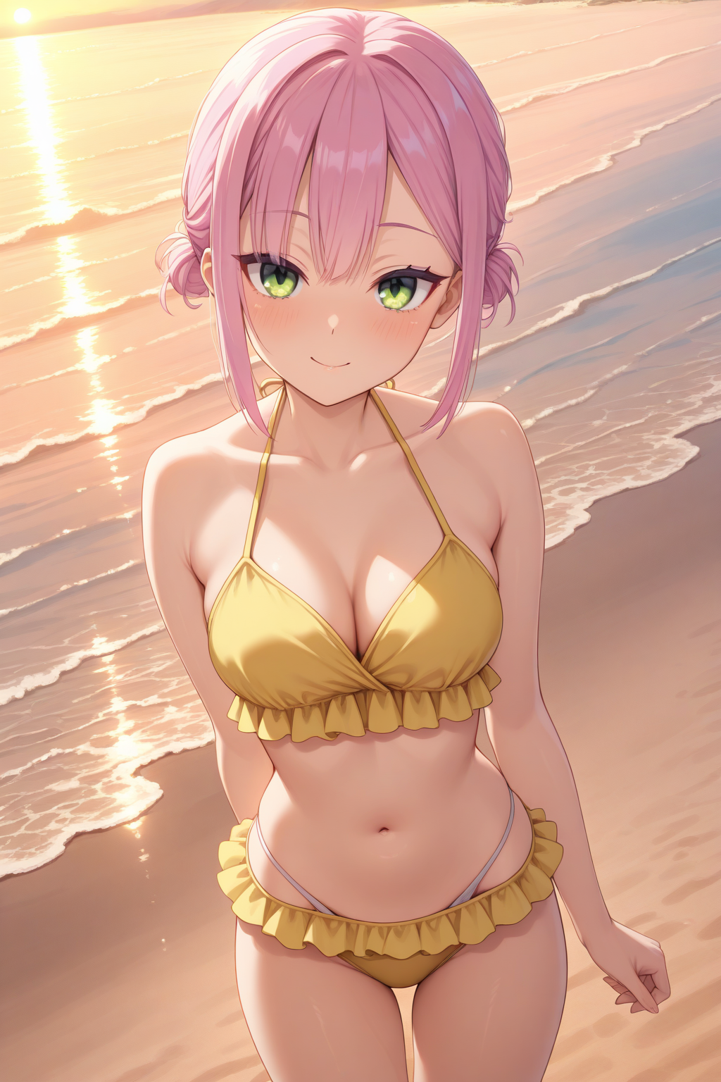 eeamane, 緑の目, ピンクの髪, わら帽子, 水着, ハルターネック, 黄色いビキニ, フリル付きビキニ, レイヤードビキニ, ハイレグビキニ,