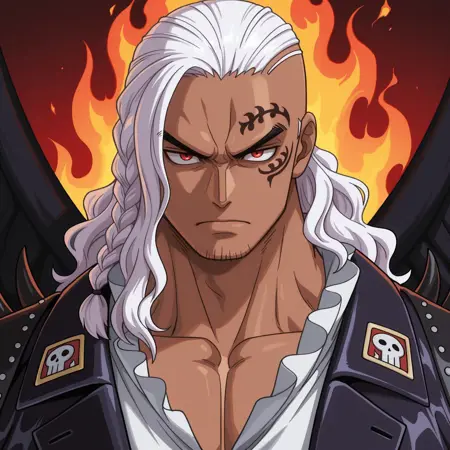 태그 (마스크 없음): 마스크 없음, 검은 피부 남성, 흰 긴 머리, 검은 눈썹, 얼굴 문신, 옆머리, 얇은 땋은 머리, 붉은 눈, 턱 수염, 벌어진 재킷, 흰색 안셔츠, (제거: 검은 스파이크, 머리 스파이크)