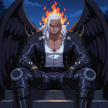 标签(月人形态): 人类,男性,阳刚,高大,黑色翅膀,红色眼睛,黑色皮质制服,长袖,黑色皮裤,黑色皮质面罩,拉链,黑色带状物,黑色尖刺,头部尖刺,黑色犄角,黑色手套,手套尖刺,蓝色镜片护目镜,纽扣,黑色靴子,白色褶边,鞘中 katana,背部火焰