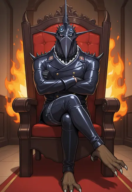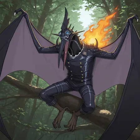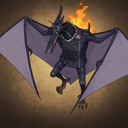 태그 (페터라노돈): 생물, 파충류, 비늘, 남성, 날개룡, 페터라노돈, 막wing, 붉은 눈, 검은 가죽 유니폼, 검은 가죽 바지, 검은 목, 부리, 지퍼, 검은 밴드, 검은 스파이크, 검은 뿔, 파란 렌즈 안경, 단추, 갈색 발, 흰색 발톱, 흰색 러플, 지퍼, 등에 불, 머리 융기