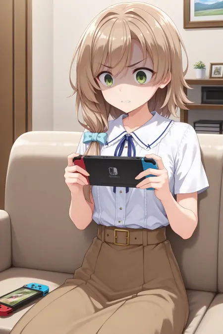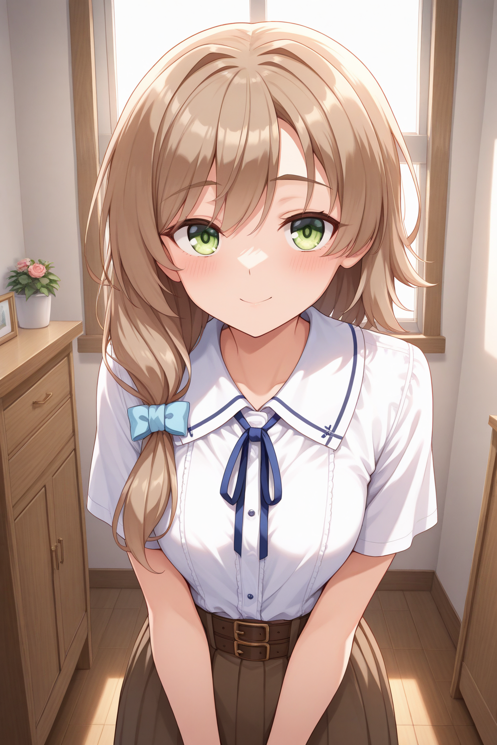 aasairi, 緑の目, 茶色の髪, 片側ポニーテール, 肩越しの髪, 髪リボン, sairicasual, 首リボン, 青いリボン, 白いシャツ, 短袖, ベルト, ハイウエストスカート, 茶色のスカート,
