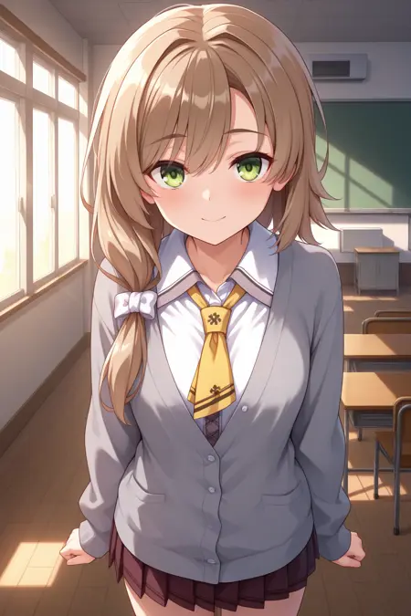 aasairi, 緑の目, 茶色の髪, 片側ポニーテール, 肩越しの髪, 髪リボン, 学校制服, 白いシャツ, 長袖, 黄色いネクタイ, 灰色のカーディガン, 茶色のスカート, プリーツスカート,
