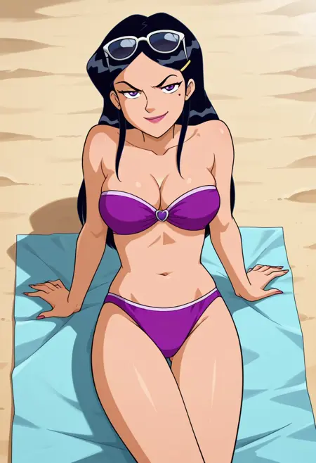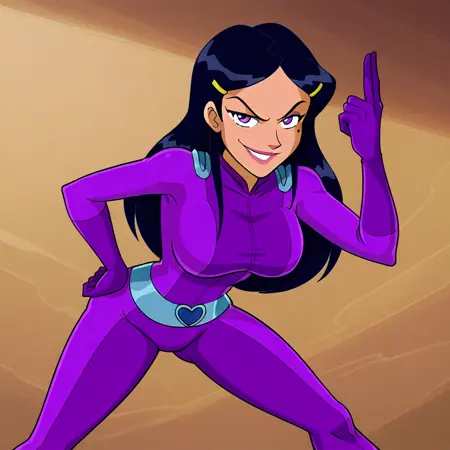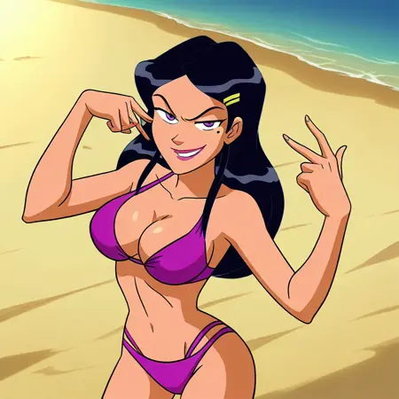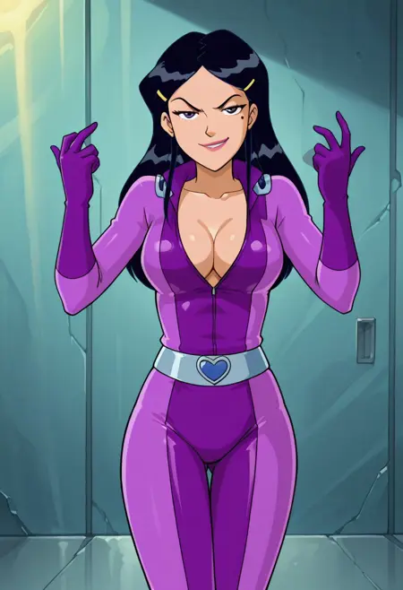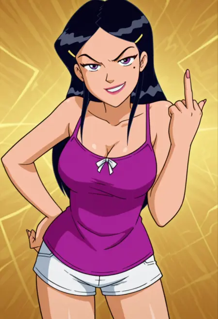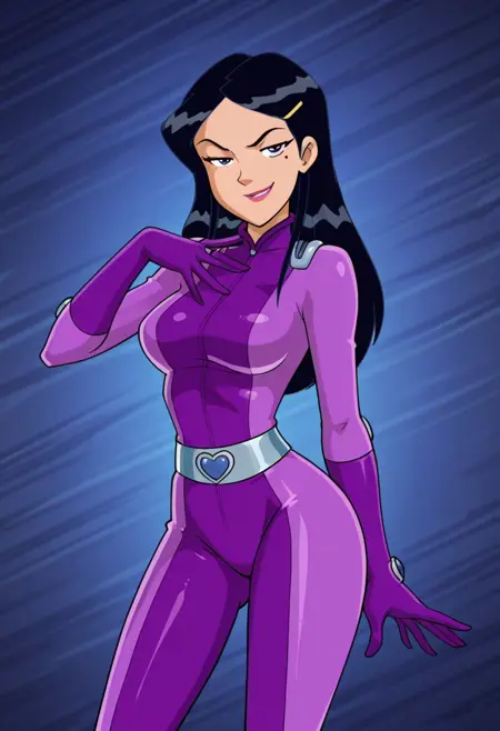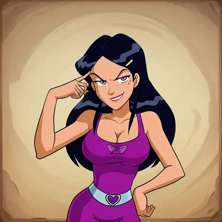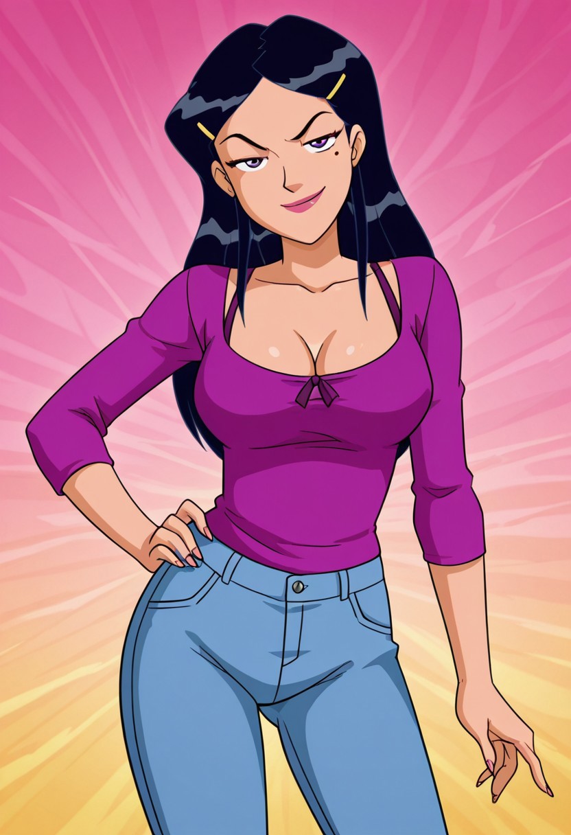 mandy_totally_spies, black hair, long hair, purple eyes, mole under eye, hair ornament