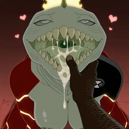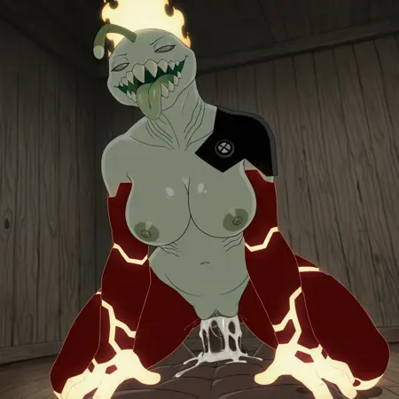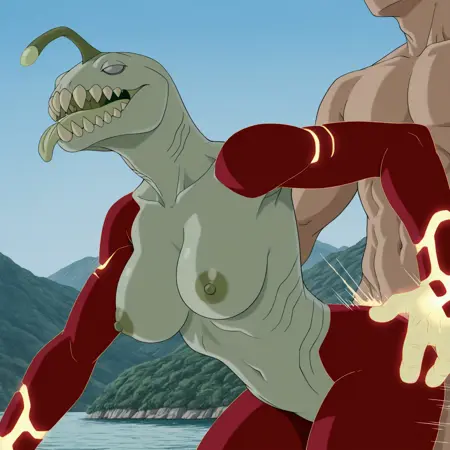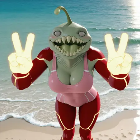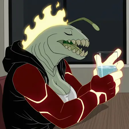 正面提示词:HeatJaws,毛茸茸的,人形动物,海洋生物,两栖生物,火元素,混合体,绿色鳞片,浅灰色眼白,无瞳孔,鳃,浅绿色身体,锋利牙齿,大牙齿,橄榄绿色舌头,红色手臂,发光双手,红色腿部,发光双脚,黑色肩甲,黑色腰饰