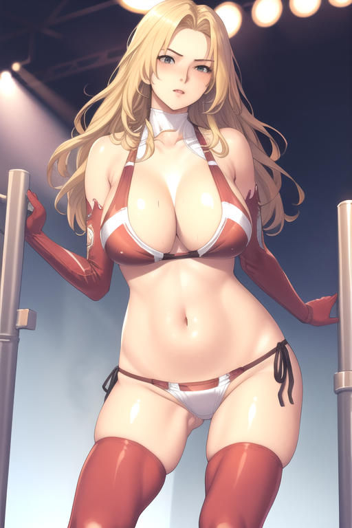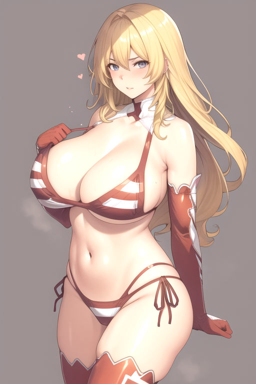 OdaNonWrestler, 1girl, solo, long hair, blonde hair, huge breasts, navel, cleavage, swimsuit, bikini, detached sleeves, midriff, thighhighs, elbow gloves, side-tie panties