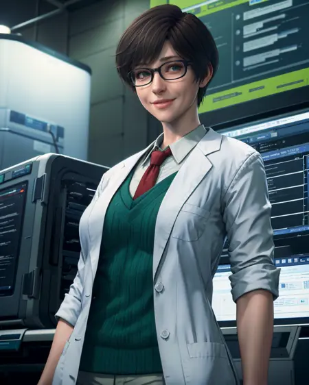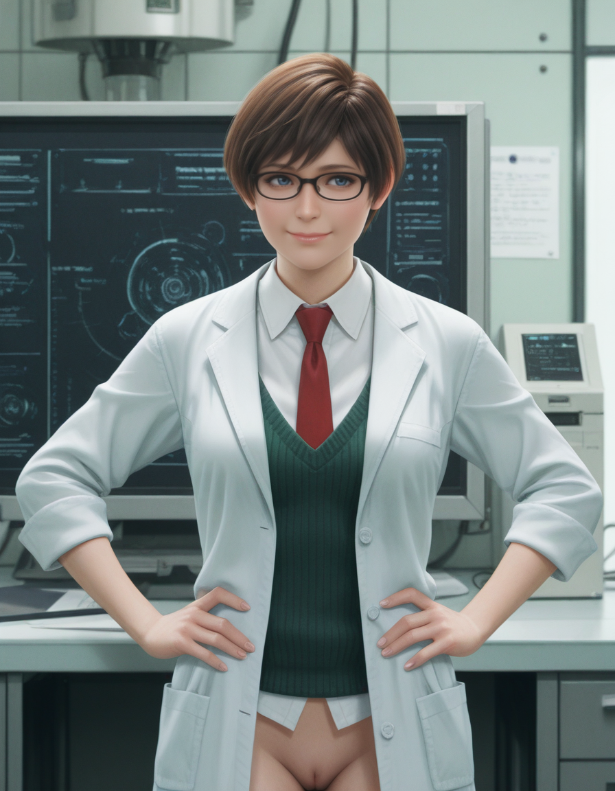VendBecky girl wearing green VendOutfitScientist and lab coat and glasses