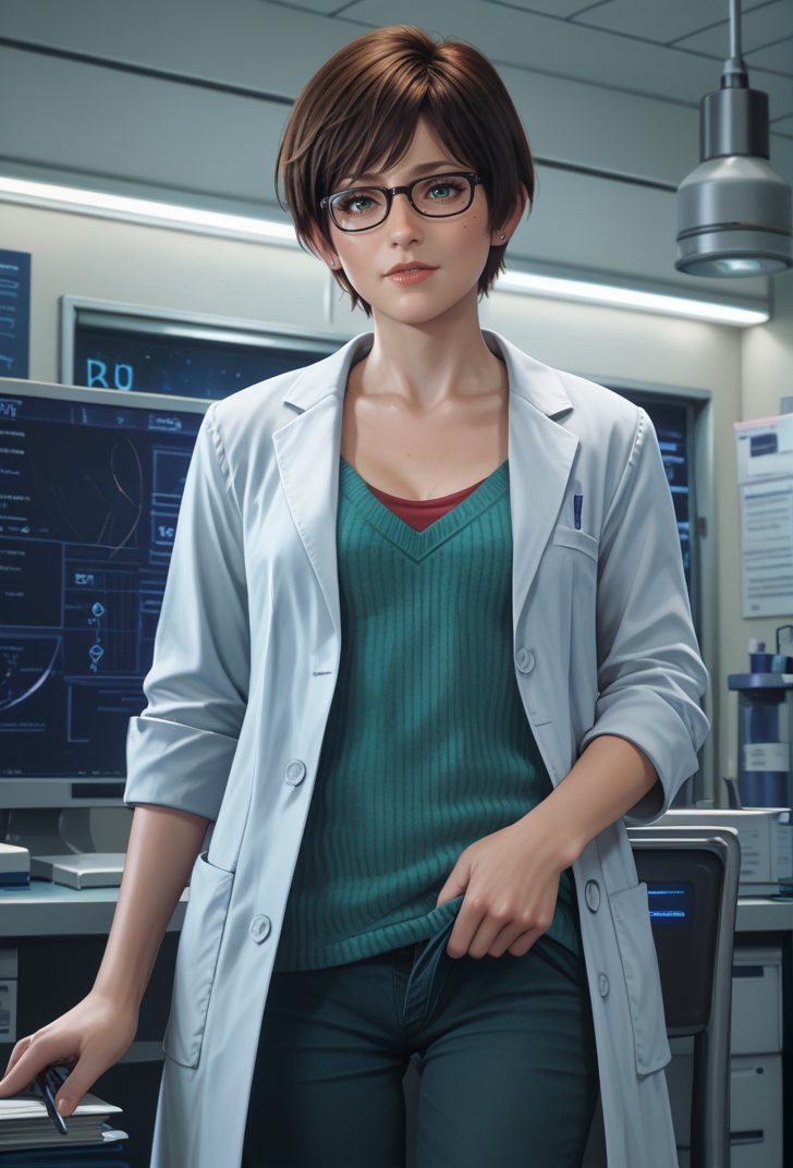 VendBecky girl wearing green VendOutfitScientist and lab coat and glasses