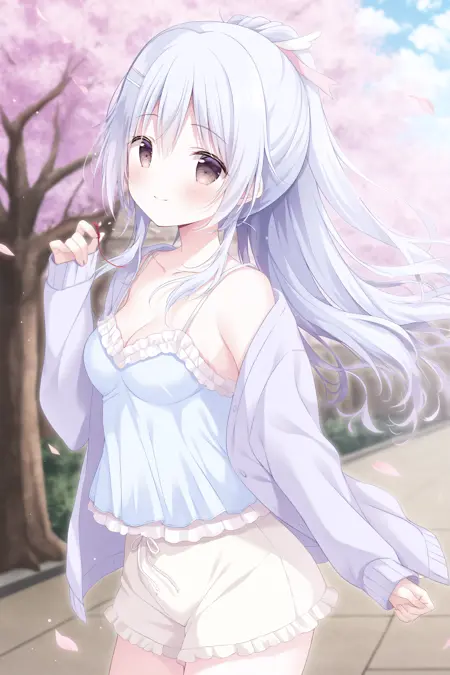 高马尾背心:1girl,阿莉安娜,休闲款阿莉安娜,长发,浅蓝色头发,高马尾,浅棕色眼睛,刘海,头发遮住眼睛,粉色发带,白色翅膀发饰,长袖,袖子超过手腕,开衫,敞开式开衫,淡紫色开衫,背心,荷叶边背心,露出胸线,短裤,宽松短裤,荷叶边短裤,淡黄色短裤,锁骨,浅蓝色背心,