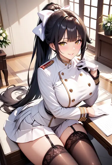 触发词:takao_a_xl,棕色眼睛,黑发,刘海,极长发,马尾,蝴蝶结,发带,白色蝴蝶结,制服,军装,长袖,裙子,迷你裙,吊袜带,过膝袜,黑色腿饰,白色手套,