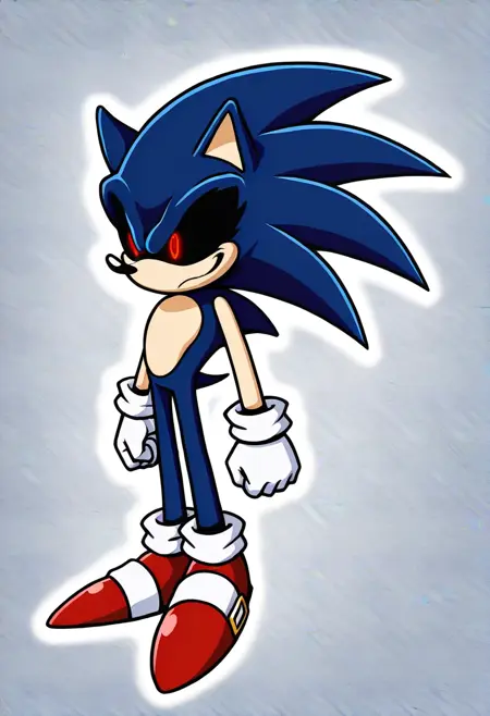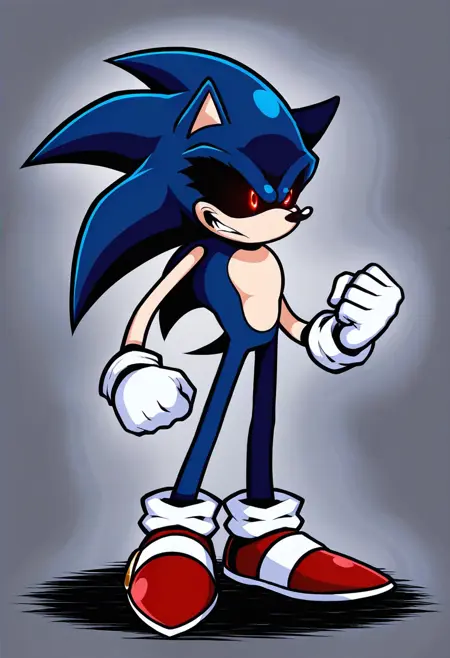 ExetiorEXE, 1boy, resembles Sonic, slightly more bluish fur, eyelashes surrounding eyes, red eyes, black sclera, white gloves, red shoes, horror,