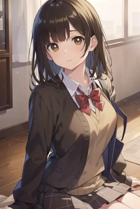 school uniform, bow, red bow, long sleeves, sweater, shirt, collared shirt, white shirt, skirt, pleated skirt, black skirt, socks, brown sweater,