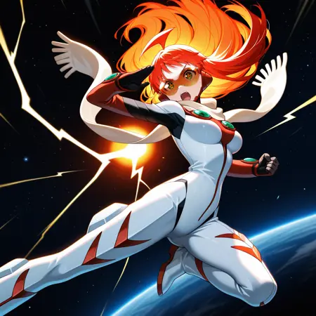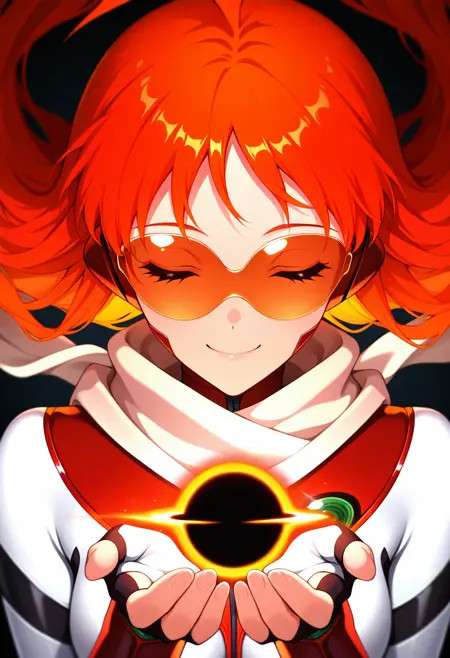 gnb_nono, 赤髪, オレンジ髪, 長髪, 浮遊する髪, アホ毛, 十字形の瞳, サングラス, 下唇, 白いスカーフ, 白いボディスーツ, 赤い手袋, 細い腰,