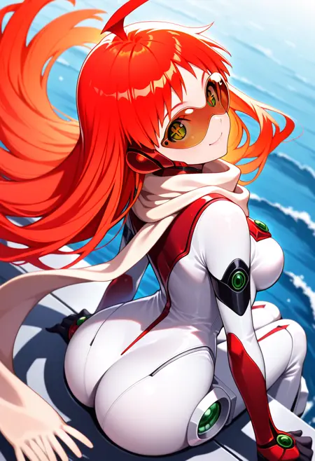 gnb_nono, 红发, 橙发, 长发, 漂浮的头发, 天线发, 十字形瞳孔, 着色眼镜, 下唇, 白色围巾, 白色紧身衣, 红色手套, 纤细腰身,