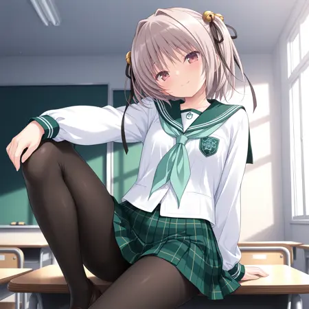 school uniform,serafuku,hair bell,hair ornament,black pantyhose,pleated skirt,miniskirt,green skirt,long sleeves,white shirt,plaid skirt,sailor collar,green sailor collar,green neckerchief,