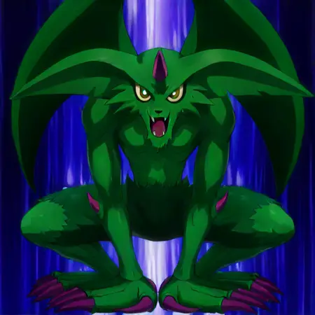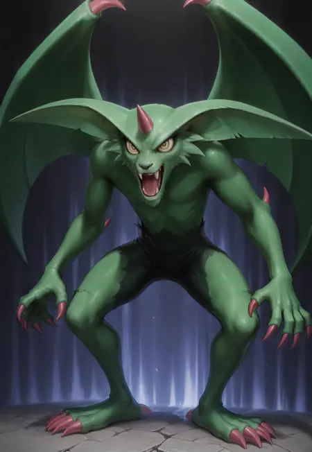 标签:狂野魔物,单人,全身,无人类,怪物男孩,绿色皮肤,单角,动物耳朵,张开嘴巴,尖牙,恶魔翅膀,爪状手指,爪状脚趾