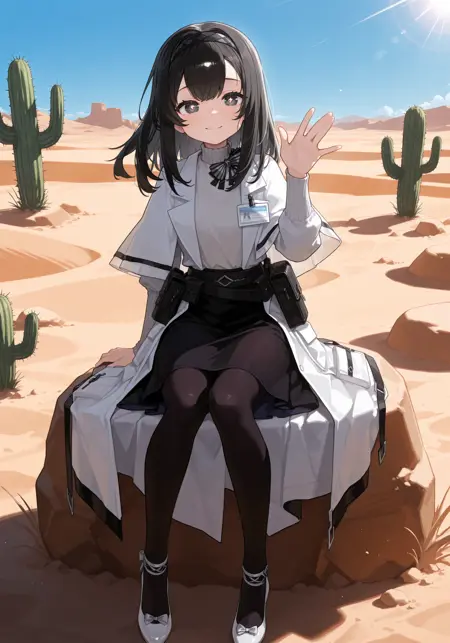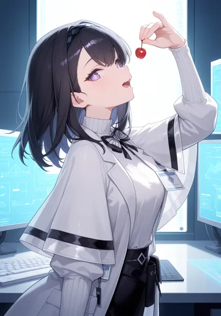 白いコート、白いタートルネックセーター、キャップレット、縞模様のボウタイ、IDカード、黒いスカート、黒いパンツストッキング、白いハイヒール