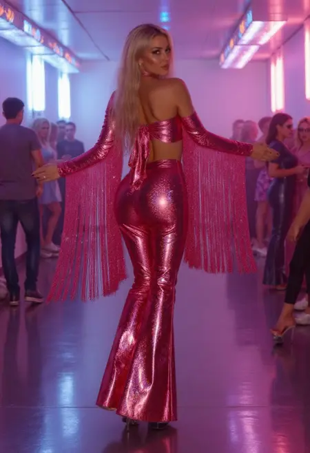 电音造型 CFH 是一款色彩斑斓、充满活力的两件套造型,专为大胆的夜生活、时尚杂志拍摄和未来主义音乐节场景设计。该造型强调动感、身形与光影,上身为闪亮面料的短款露脐上衣,采用戏剧性的系带前襟设计,搭配超长亮片流苏袖;下身为高腰紧身喇叭裤,裤脚大幅外扩。