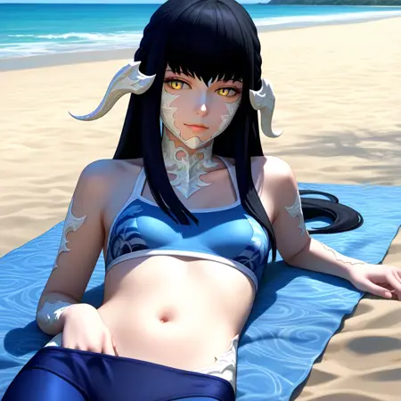 보조 단어: au ra, 검은 머리, 긴 머리, 앞머리, 드래곤 뿔, 비늘, 노란 눈,