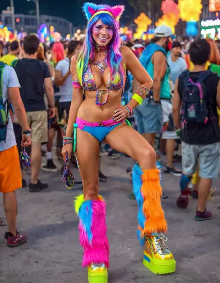 Rave Girls XL은 자신감과 장난스러움을 드러내는 대담하고 화려한 패션을 추구합니다. 네온 색상의 바디수트, 피시넷 스타킹, 반짝이는 크롭탑, 홀로그램 스커트 등 이 스타일은 미래적이고 환상적인 요소들이 혼합된 심미적인 페스티벌 풍입니다. 피부를 드러내는 디자인, 눈에 띄는 액세서리, 바디페인팅을 중시하는 이 스타일은, 밤을 밝히는 네온 조명과 레이저 빔처럼 개성과 창의성이 빛나는 댄스플로어에서 자기 표현과 자유로운 정신을 장려합니다. 이는 경계를 깨고, 과도한 MDMA를 섭취하며, 레이브 문화의 전율적인 에너지를 축하하는 패션 서브컬쳐입니다.