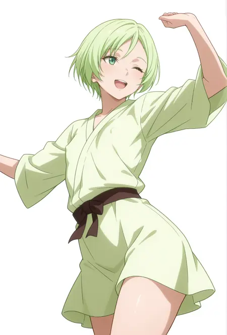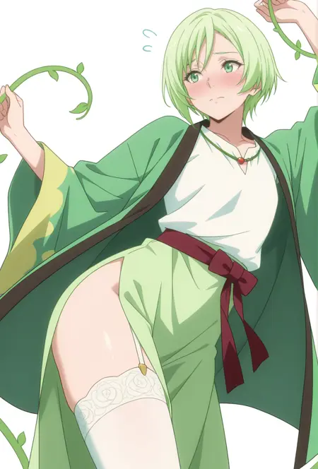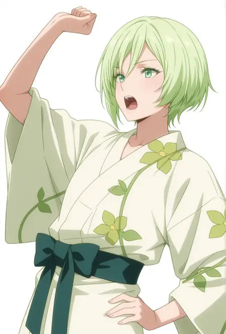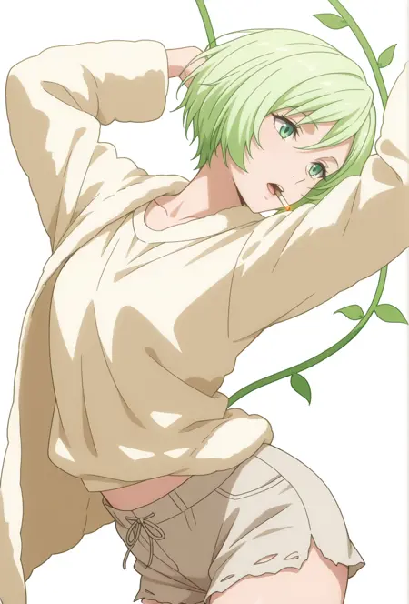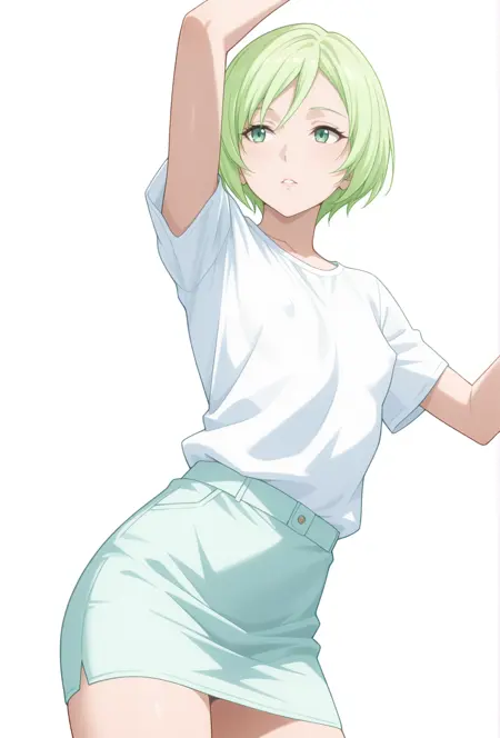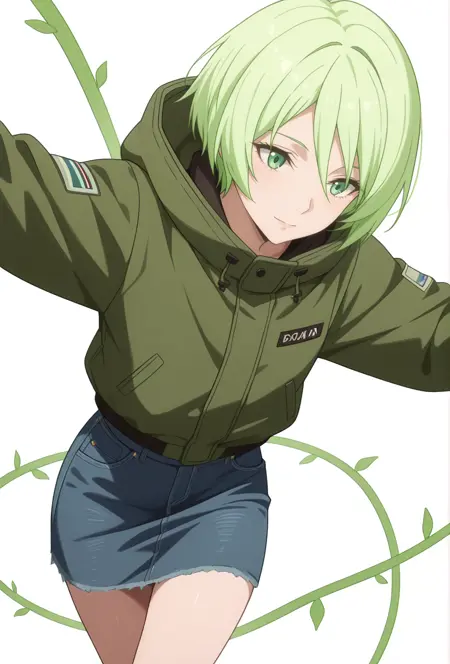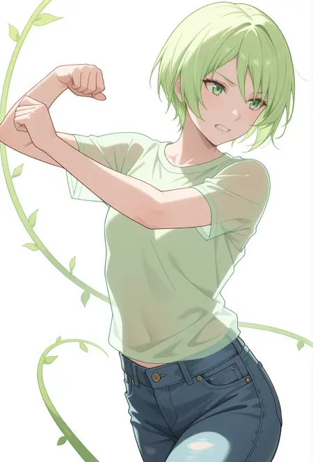 trya_cnr, 1girl,green hair, short hair, green eyes, androgynous,