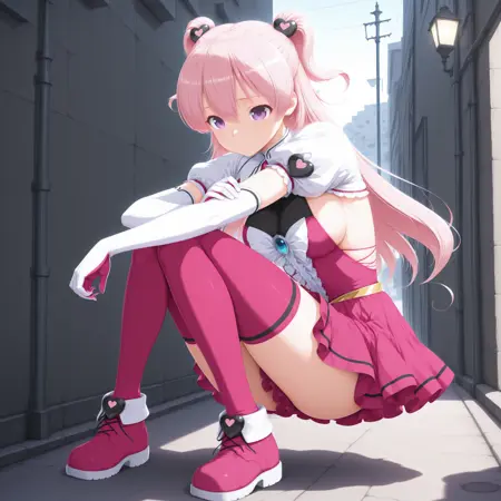 izumi asakura,purple eyes,long hair,pink hair,two side up,medium breasts,multicolored dress,frilled dress,pink dress,black dress,collared shrug,white shrug,short sleeves,puffy sleeves,elbow gloves,white gloves,pink thighhighs,pink footwear,heart hair ornament,chest jewel,blue gemstone