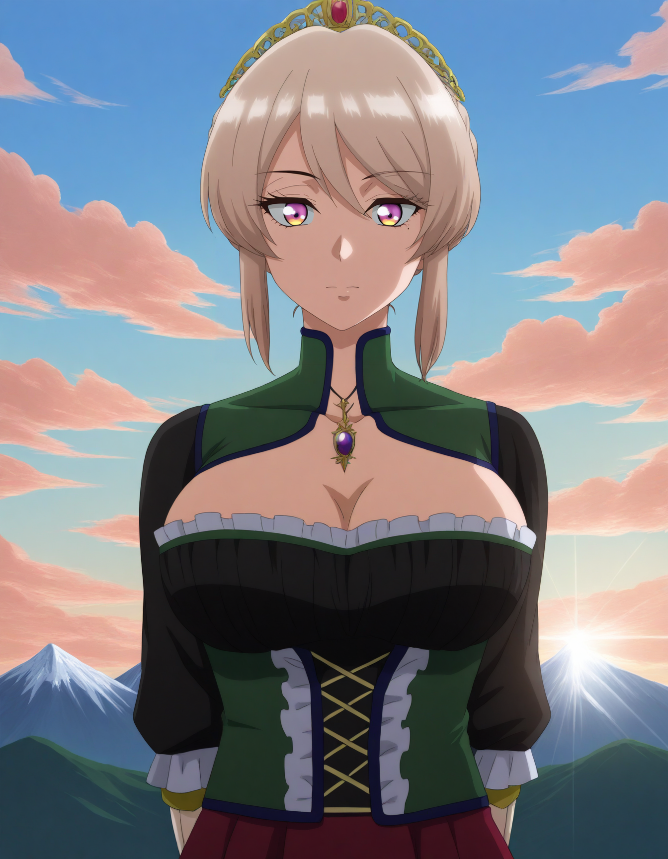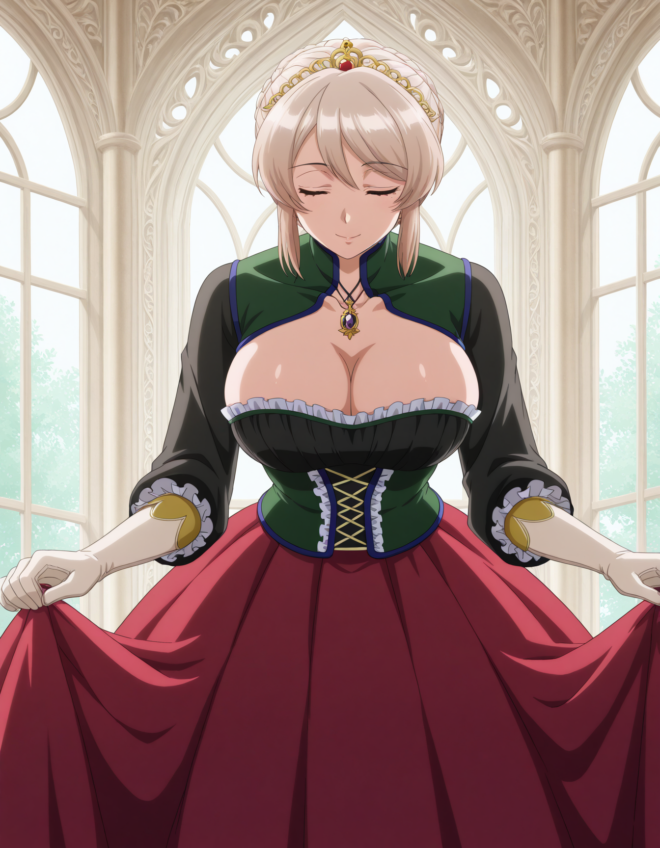 티아라, 펜던트, 녹색 셔츠, 검은 셔츠, 가슴 부분 절개, 코르셋, 팔꿈치 장갑, 빨간 치마, 긴 치마 옵션: 빨간 망토 진주 목걸이부정 프롬프트: (옵션)
