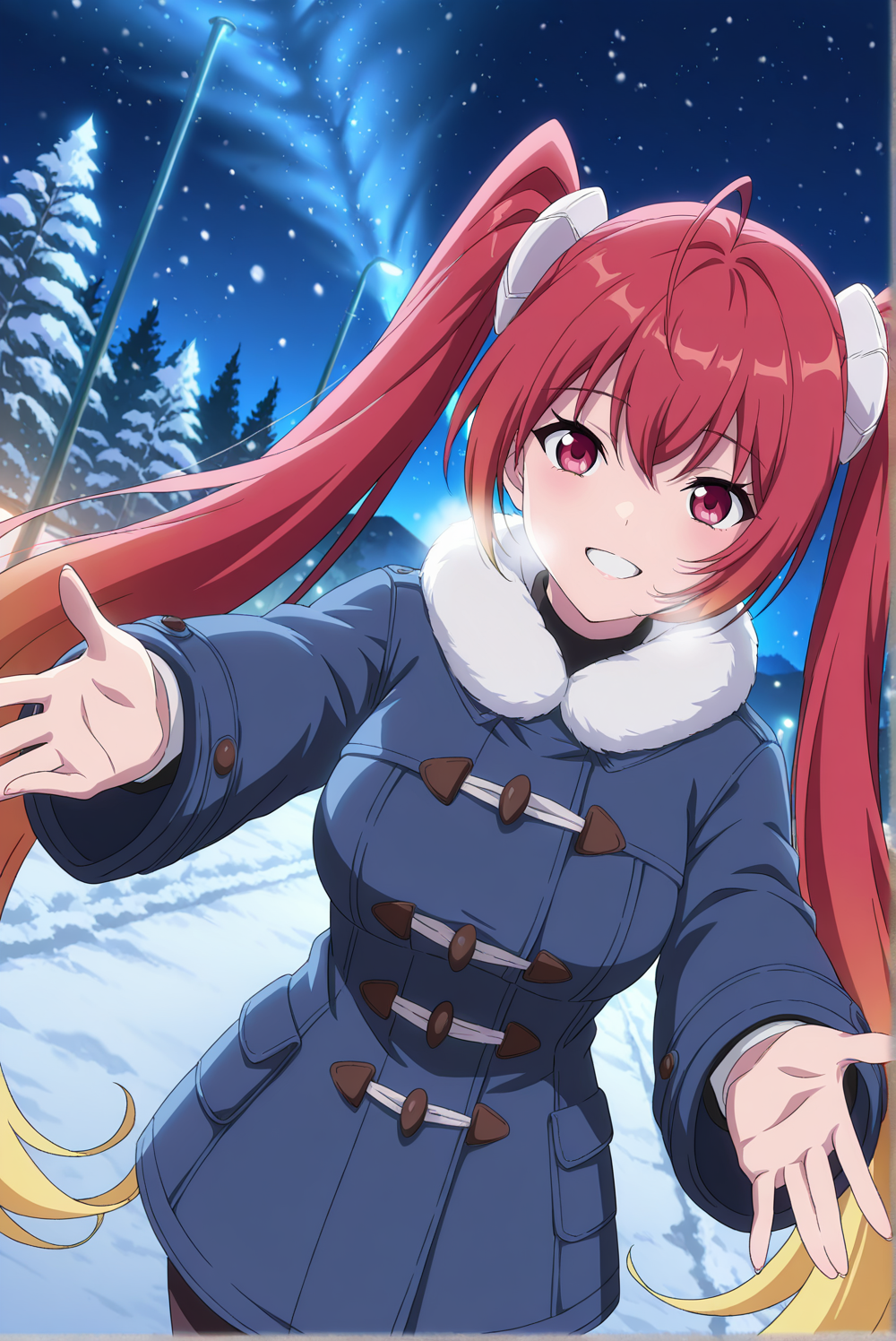 Basic: t-red, 1girl, red eyes, red hair, twintails, very long hair, ahoge, gradient hair, multicolored hair