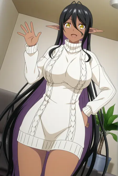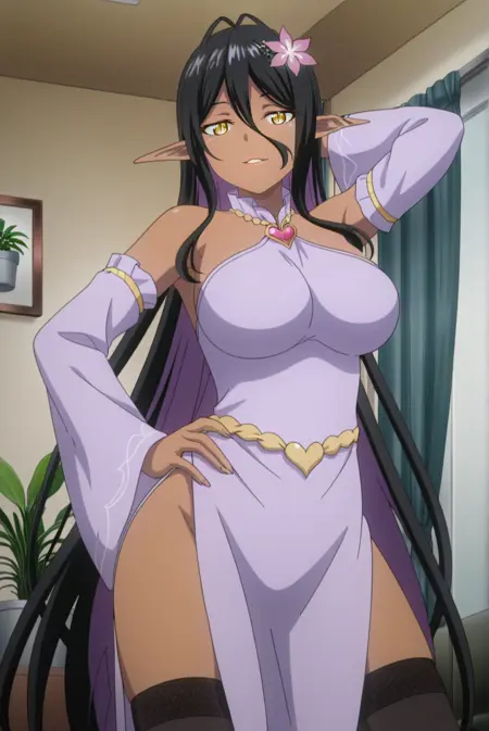 <lora:Mariabelle-IL-v1-08:0.9>, ChopioM4riabelle, 非常に長い髪、黒髪、ツートーンヘア、アンテナヘア、横髪、目と目の間の髪、黄色い目、細い瞳孔、長い尖った耳、視線を観察者に向ける、