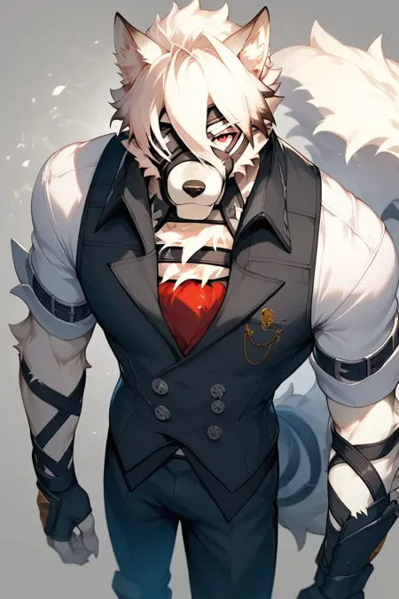 1boy,Von Lycaon,animal ears,furry male, wolf ears, tail, furry, red eyes, white hair, wolf tail,white fur, black vest, vest, shirt,eyepatch,