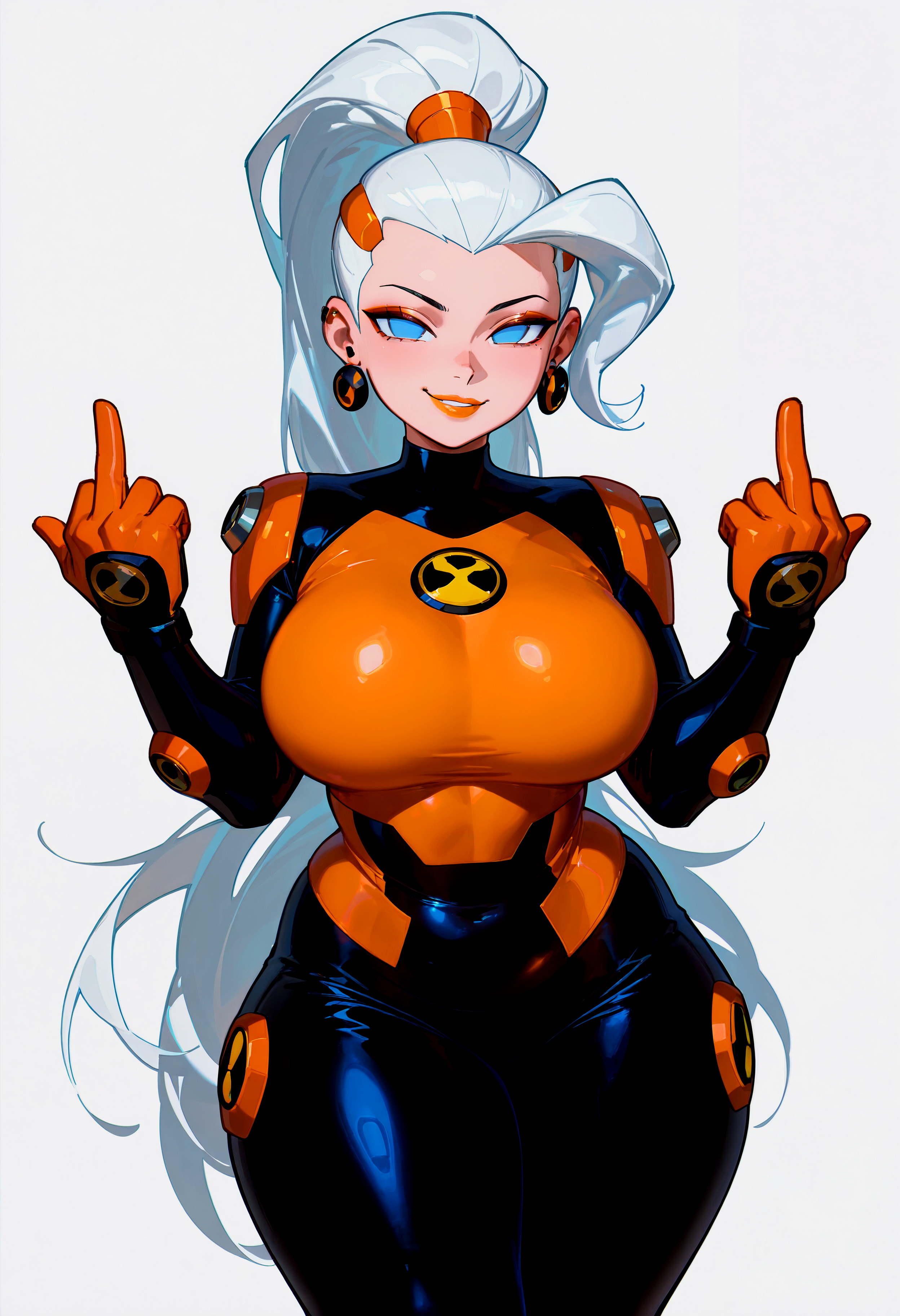 1girl, 볼륨 있는 입술, 메이크업, 립스틱, 파란 눈, 동공 없음, 매우 긴 머리, 높은 플랫테일, 머리를 뒤로 묶음, 흰 머리, 앞머리, 머리 장식, 큰 가슴, 넓은 엉덩이, (두꺼운 허벅지:1.2),