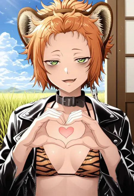 ボーイッシュ、短い髪、乱れた髪、オレンジ色の髪、オレンジ色の眉毛、緑の目、小さな胸、虎の耳、首輪、鎖、レザージャケット、腹部露出、虎模様、ビキニ、大腿部まであるストッキング、太ももブーツ。