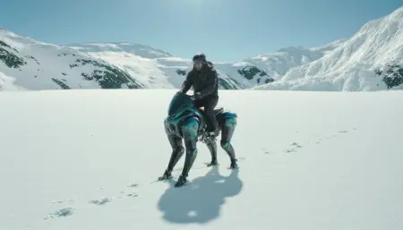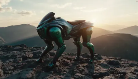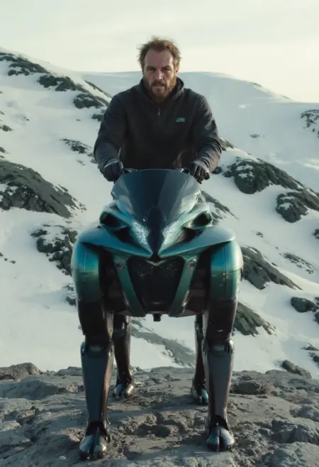 Kawasaki Corleoライダーのグループが、広大な砂漠の平原を左から右へと駆け抜ける。ロボットの蹄から砂の軌跡が飛び散り、バイクはマットなブロンズ、エメラルドグリーン、クロムシルバー。強い日差しの下でキラキラと輝き、各バイクにはネオンの発光する脚関節が備わっている。ライダーは砂漠用の装備とビジュアルを装着。ドラマチックな熱波の地平線とゴールデンオレンジのトーン。映画的で広角のFLUXレンダリング。サイドビュー